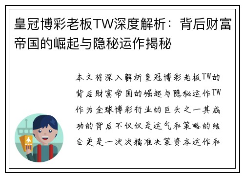 本文将深入解析皇冠博彩老板TW的背后财富帝国的崛起与隐秘运作。TW作为全球博彩行业的巨头之一,其成功的背后不仅仅是运气和策略的结合,更是一次次精准决策、资本运作和隐秘操作的综合体现。从最初的小规模经营到如今庞大的博彩网络帝国,TW的财富积累历程充满了复杂的商业策略和不为人知的幕后故事。本文将从四个方面详细阐述其财富帝国的崛起:首先,分析TW如何从一名普通的博彩从业者逐步崭露头角,建立起自己的博彩王国;其次,探讨TW的资本运作方式和资金流向,包括其如何通过复杂的公司结构和国际市场扩张获得巨额财富;再次,揭示TW在博彩行业中的隐秘运作,包括如何通过科技手段增强平台的吸引力与用户黏性,维持行业领先地位;最后,探讨TW如何通过品牌塑造与社会责任的承担,在公众面前塑造正面形象,确保其企业形象的稳固。这些方面相互交织,形成了一个庞大且隐秘的财富帝国。
