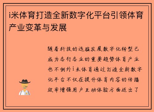 随着科技的迅猛发展,数字化转型已成为各行各业的重要趋势,体育产业也不例外。i米体育通过打造全新数字化平台,不仅在提升体育内容的传播效率、增强用户互动体验方面迈出了重要步伐,更引领着体育产业的变革与发展。本篇文章将从四个方面详细阐述i米体育如何借助数字化平台实现这一目标:首先是数字化平台对体育产业的创新性影响,其次是平台如何提高体育赛事的观众参与度,再者是数字化平台在提升商业价值和品牌影响力方面的作用,最后探讨数字化转型对体育产业未来发展的深远影响。通过这些分析,本文将全面呈现i米体育在推动体育产业变革中的积极作用。